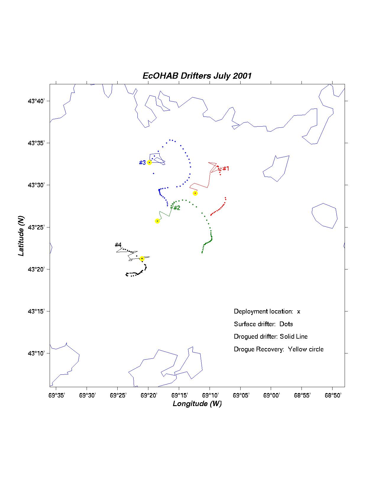 | Drifter D3 (PTT 17265) Deployed | 07/27/01 | 19:00 | 43° 32.7´N | 69° 19.8´W | 159 | Recovered 28 Jul/2050z at 43 32.7N, 69 18.0W |
