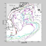 All five had drogues at a depth of 40 meters. The drifting buoys transmitted via Service Argos