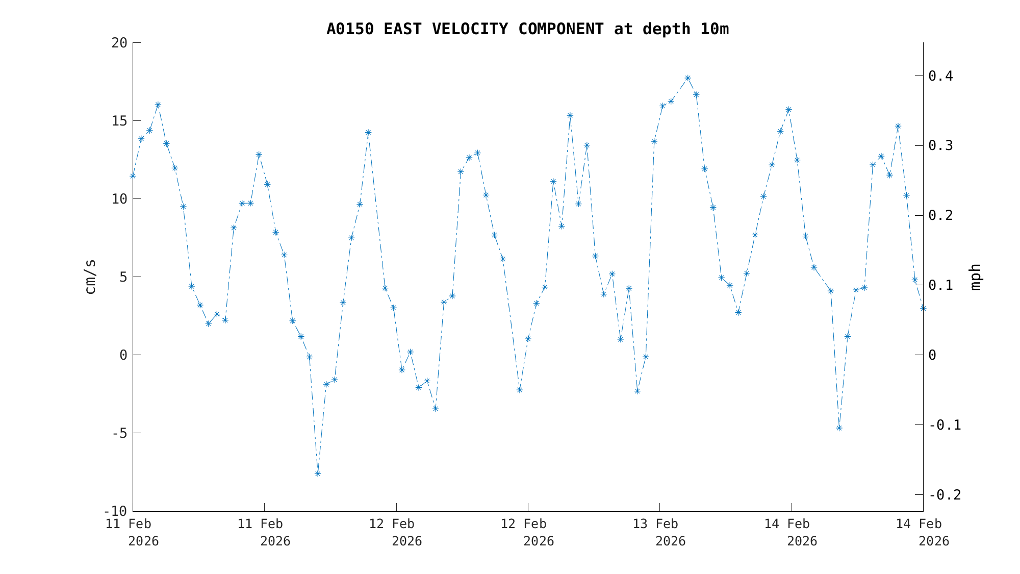 | North Current Velocity (10m) | -1.0 cm/s (-0.02 kts) | 2026-02-14 16:00:00 |