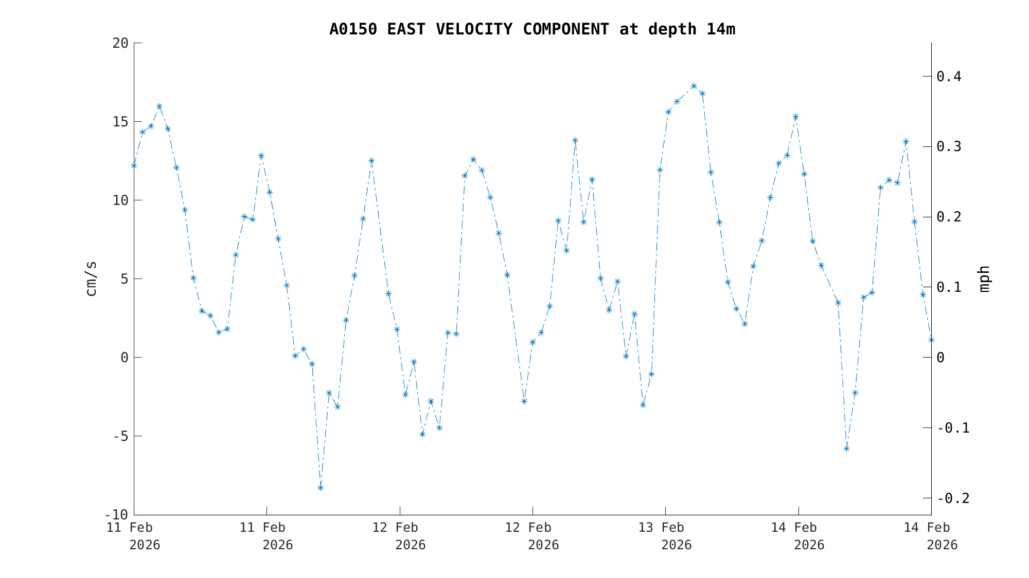 | North Current Velocity (14m) | 0.1 cm/s (0.00 kts) | 2026-02-14 16:00:00 |