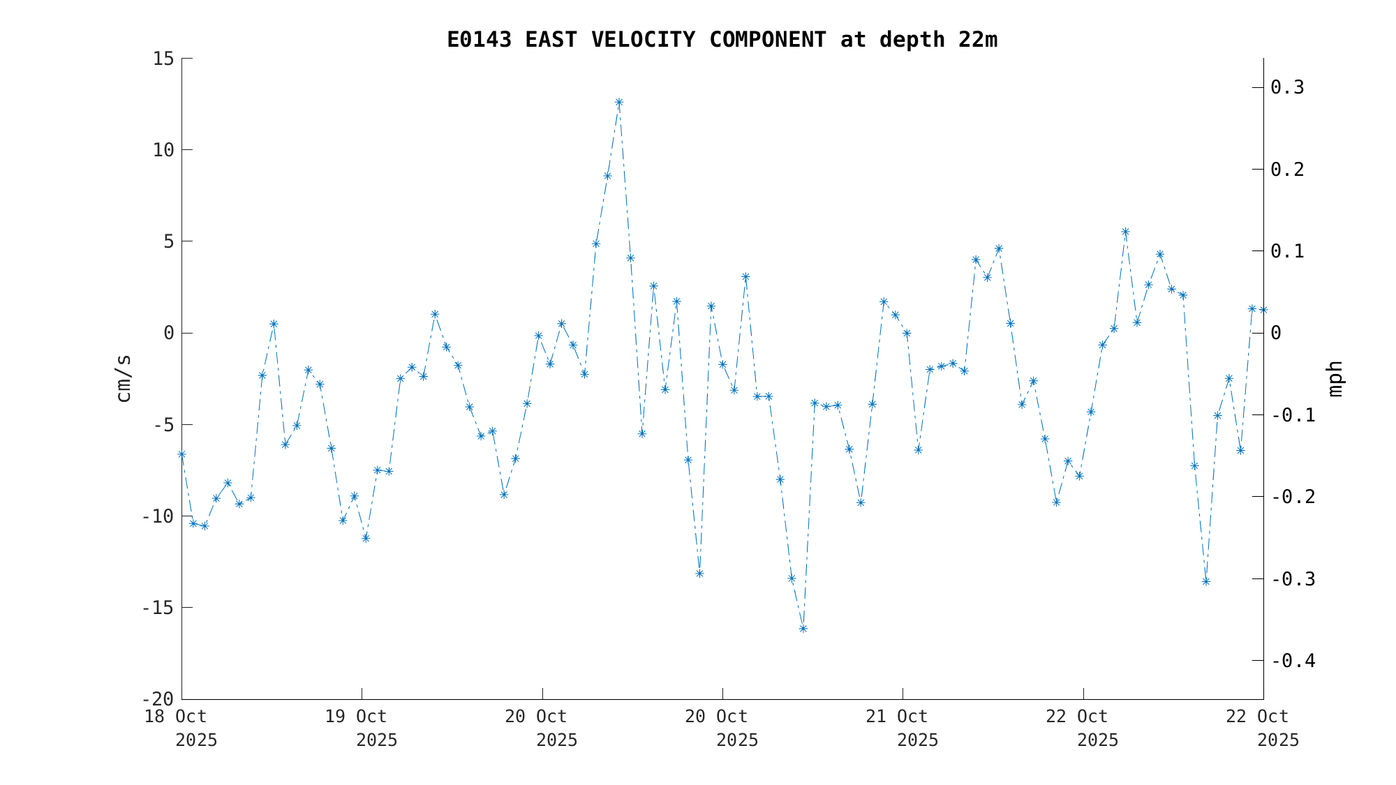 East Current Velocity (18m) | -5.0 cm/s (-0.10 kts) | 2025-10-22 14:00:00 |