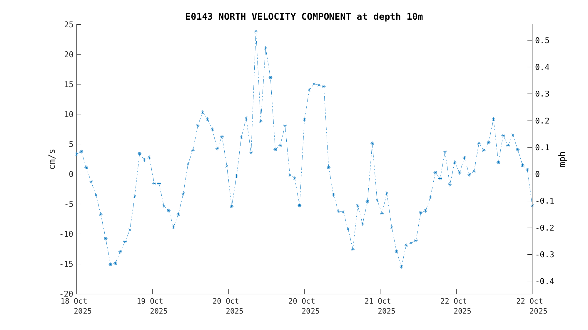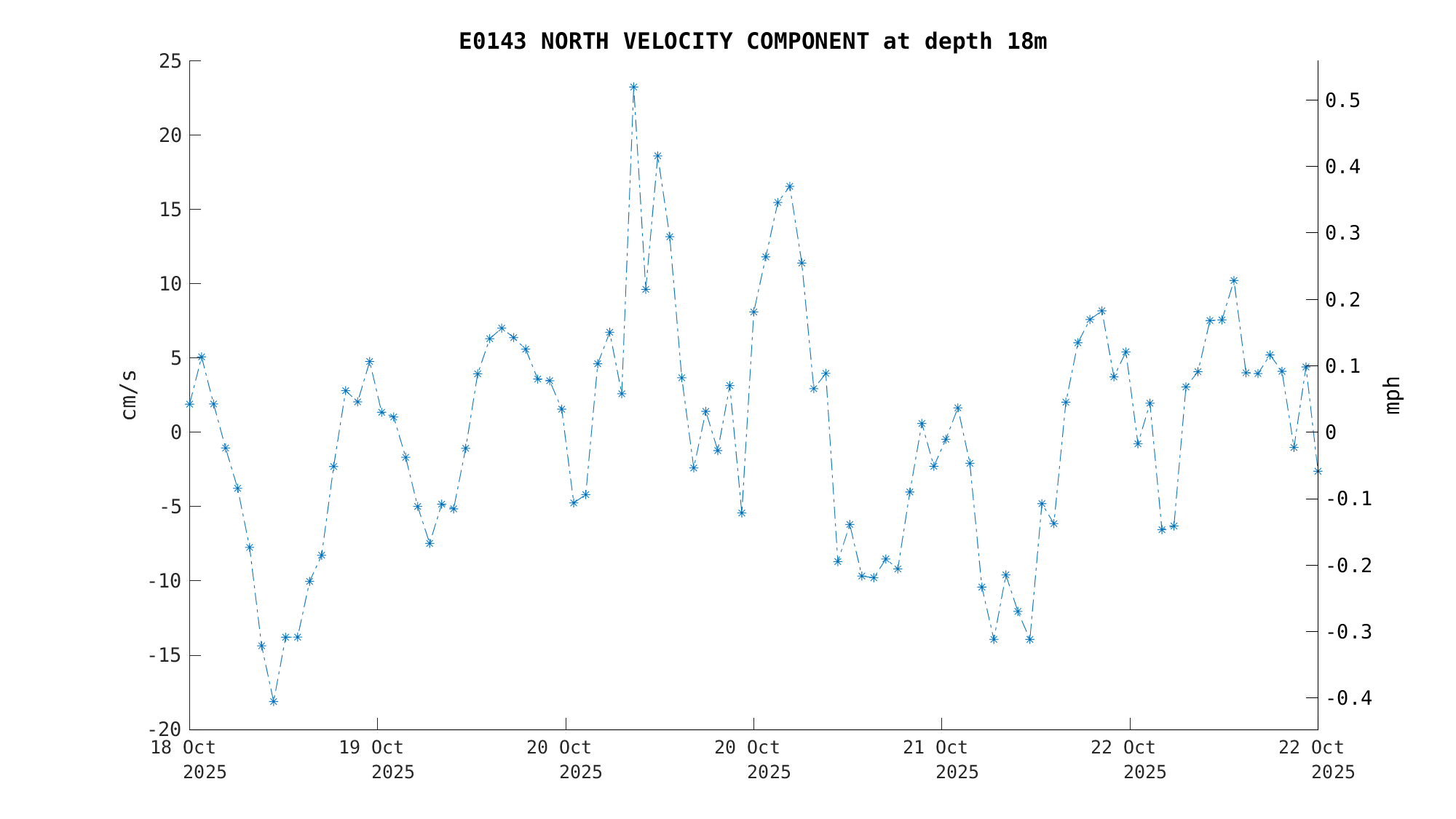 North Current Velocity (18m) | -1.0 cm/s (-0.02 kts) | 2025-10-22 14:00:00 |