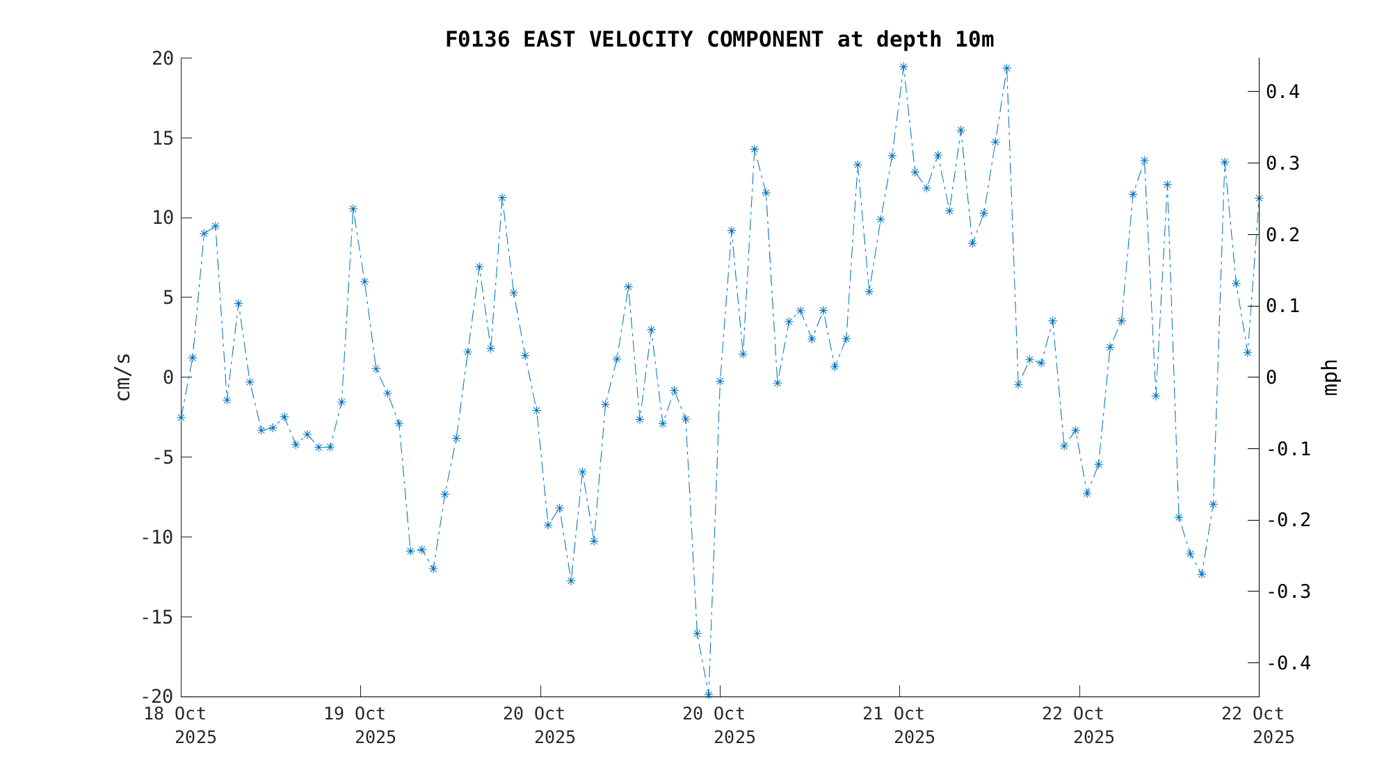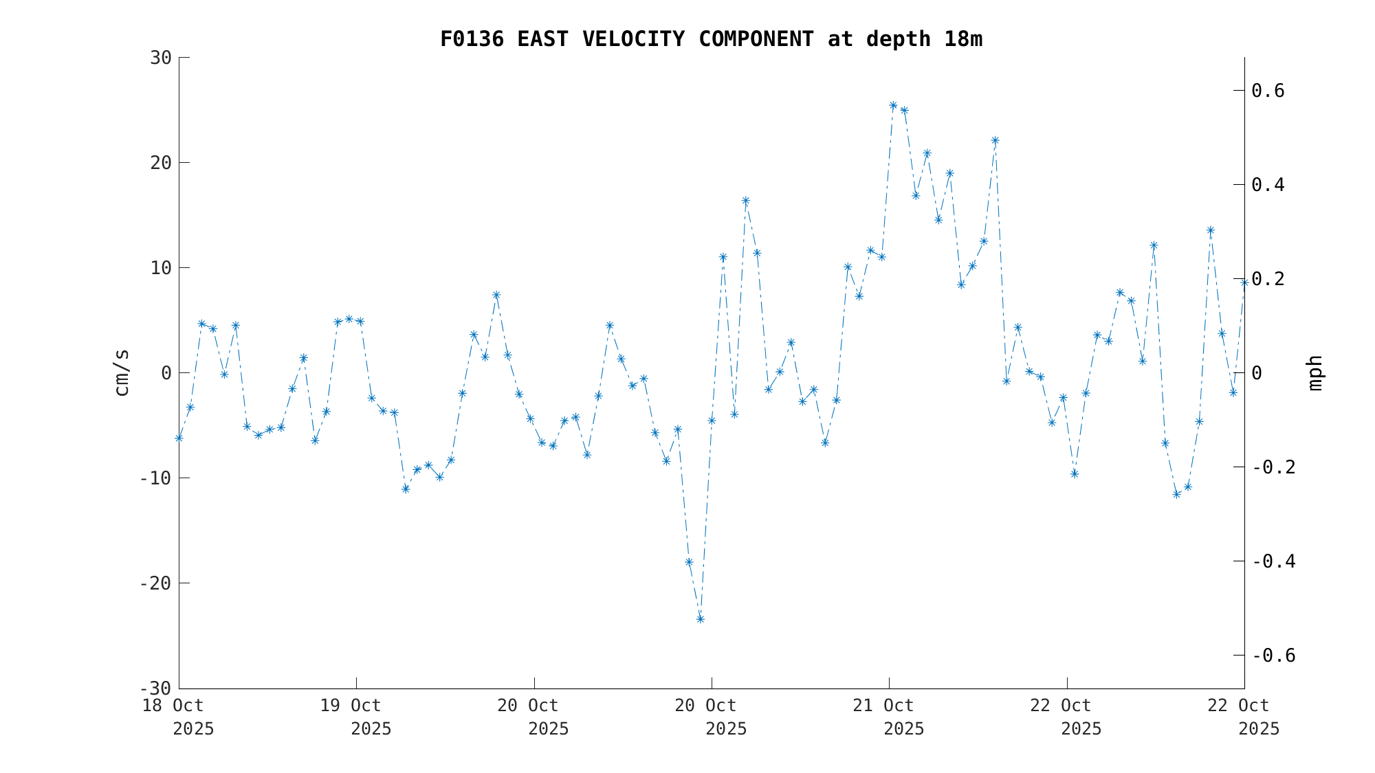 East Current Velocity (18m) | 3.8 cm/s (0.07 kts) | 2025-10-22 14:00:00 |