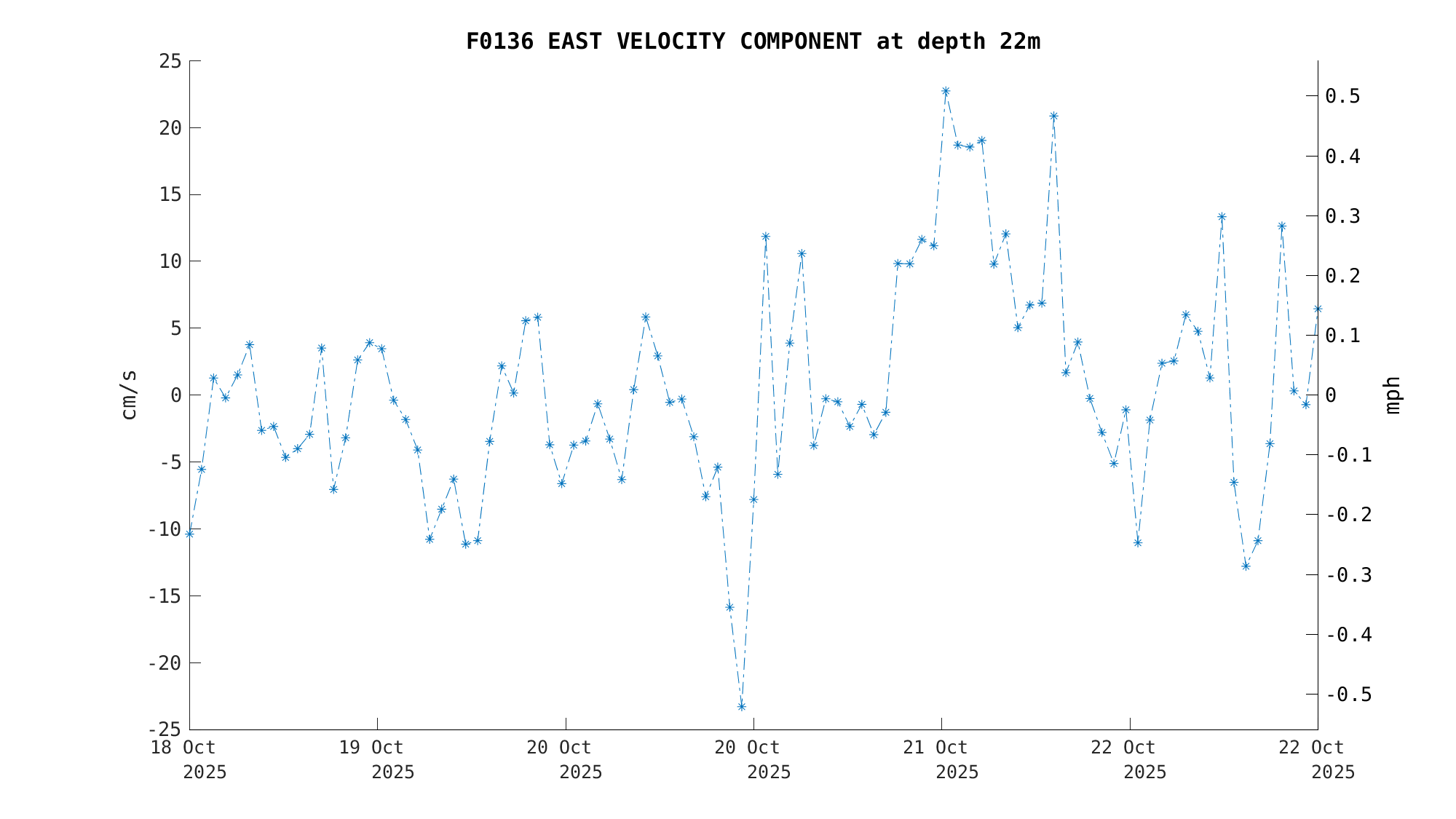 East Current Velocity (22m) | 0.3 cm/s (0.01 kts) | 2025-10-22 14:00:00 |