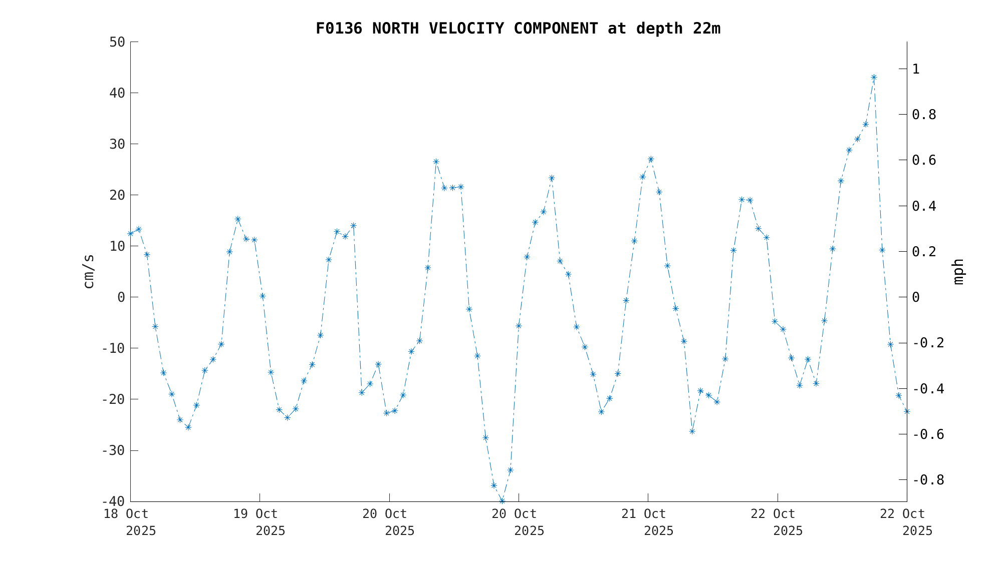 North Current Velocity (22m) | -9.2 cm/s (-0.18 kts) | 2025-10-22 14:00:00 |