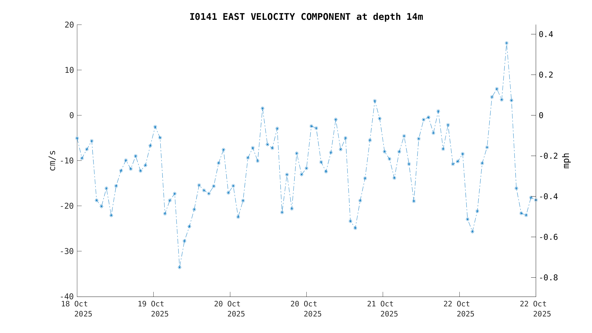 East Current Velocity (14m) | -22.0 cm/s (-0.43 kts) | 2025-10-22 14:00:00 |