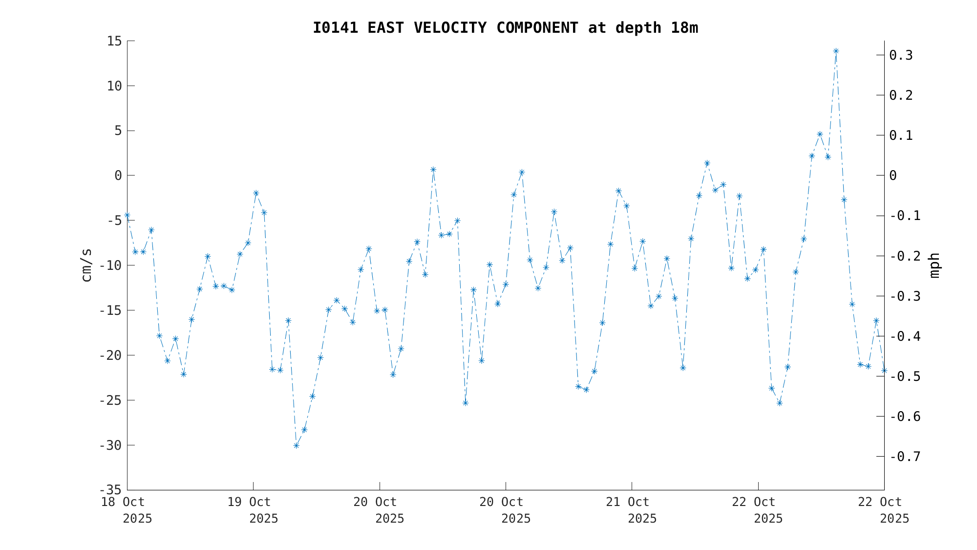 East Current Velocity (18m) | -21.2 cm/s (-0.41 kts) | 2025-10-22 14:00:00 |