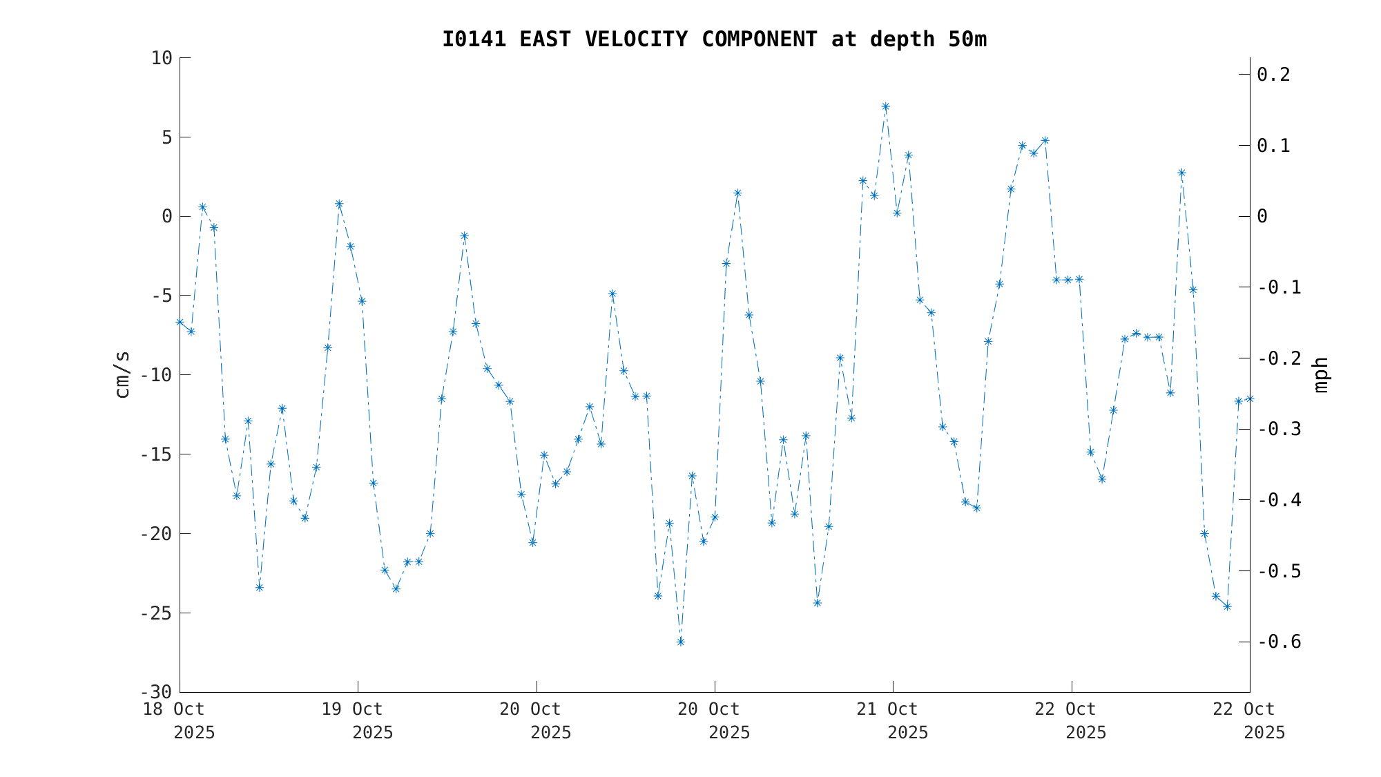 East Current Velocity (50m) | -24.6 cm/s (-0.48 kts) | 2025-10-22 14:00:00 |