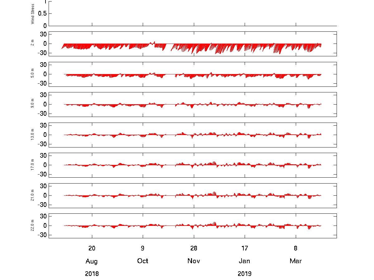Hourly averaged wind stress at 4 m and currents (rotated to true north) at 2 m (current meter) and from 10 m to a maximum of 126 m (Doppler).