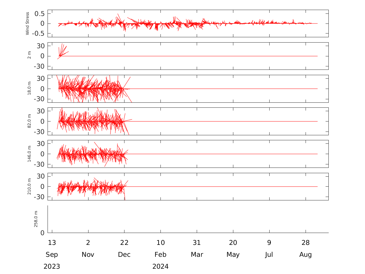 Hourly averaged wind stress at 4 m and currents (rotated to true north) at 2 m (current meter) and from 10 m to a maximum of 126 m (Doppler).