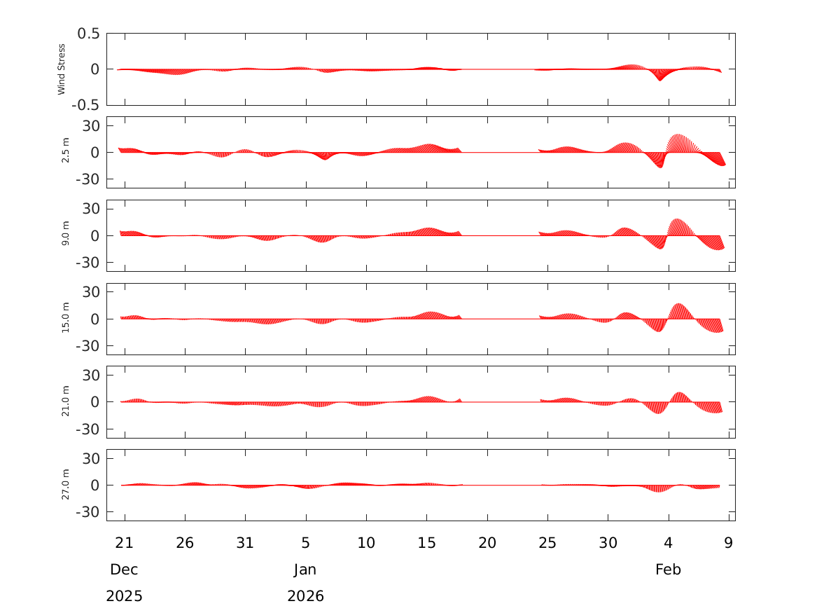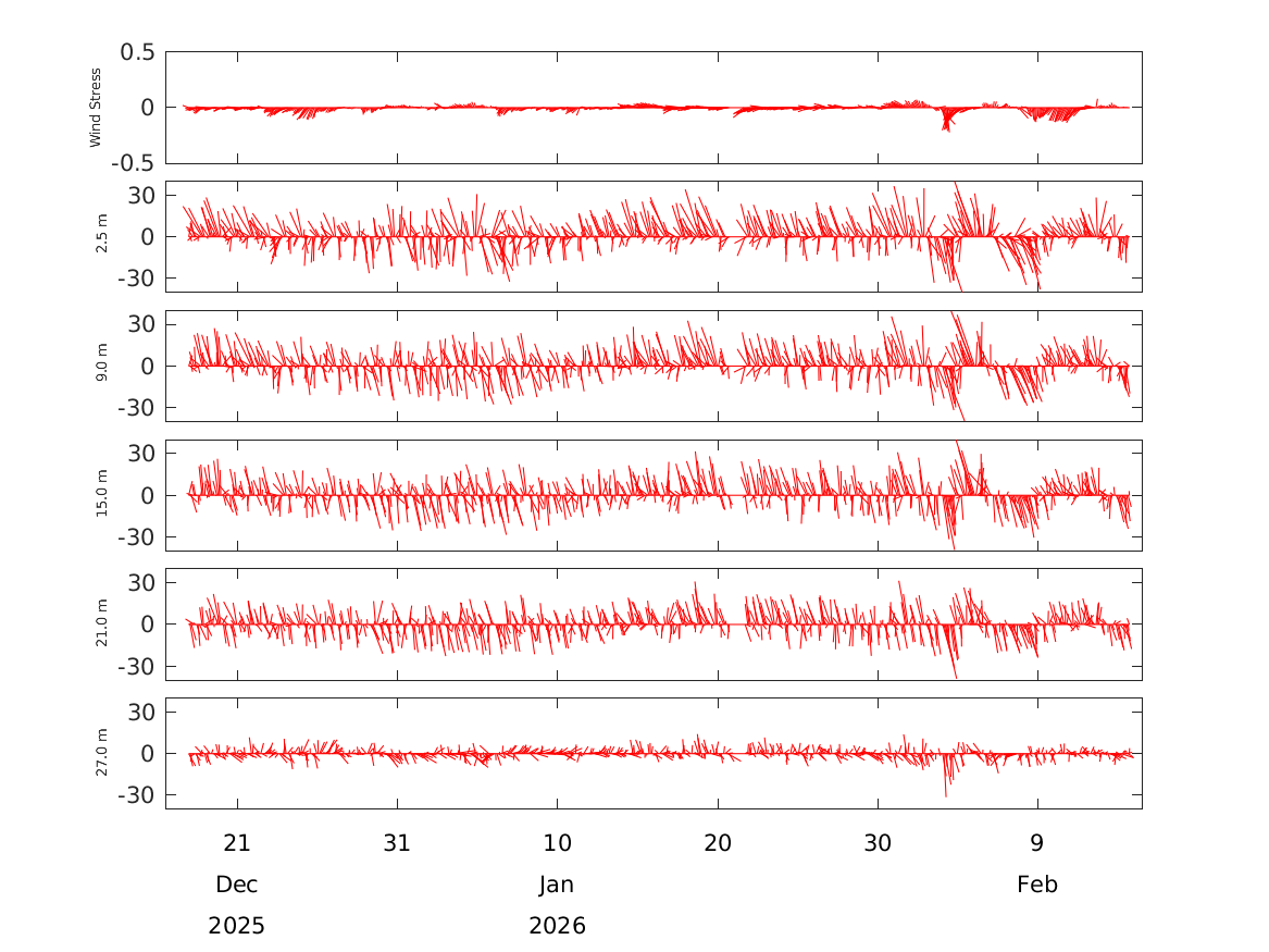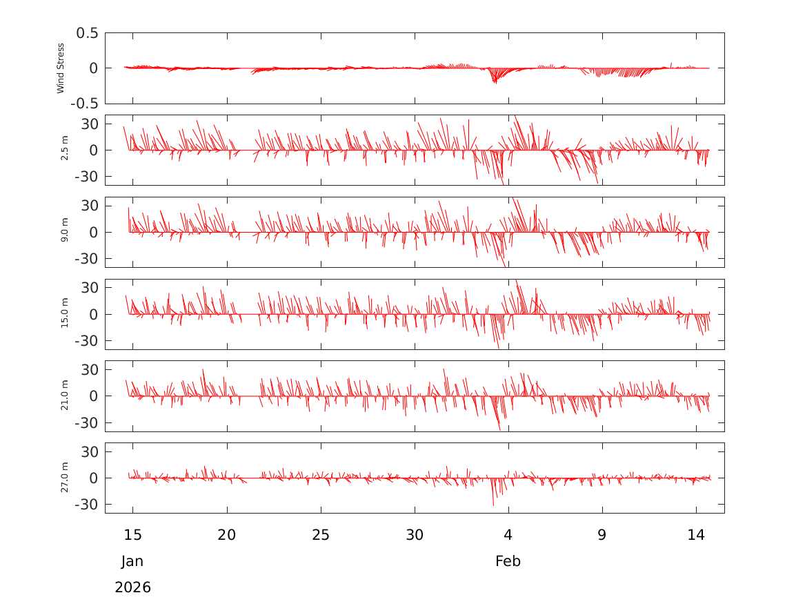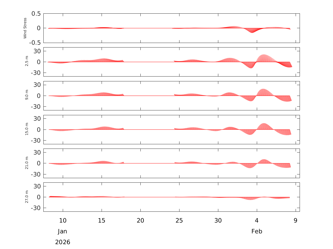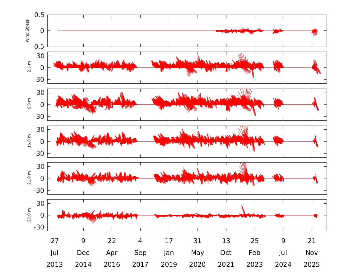 Hourly averaged wind stress at 4 m and currents (rotated to true north) at 2 m (current meter) and from 10 m to a maximum of 126 m (Doppler).