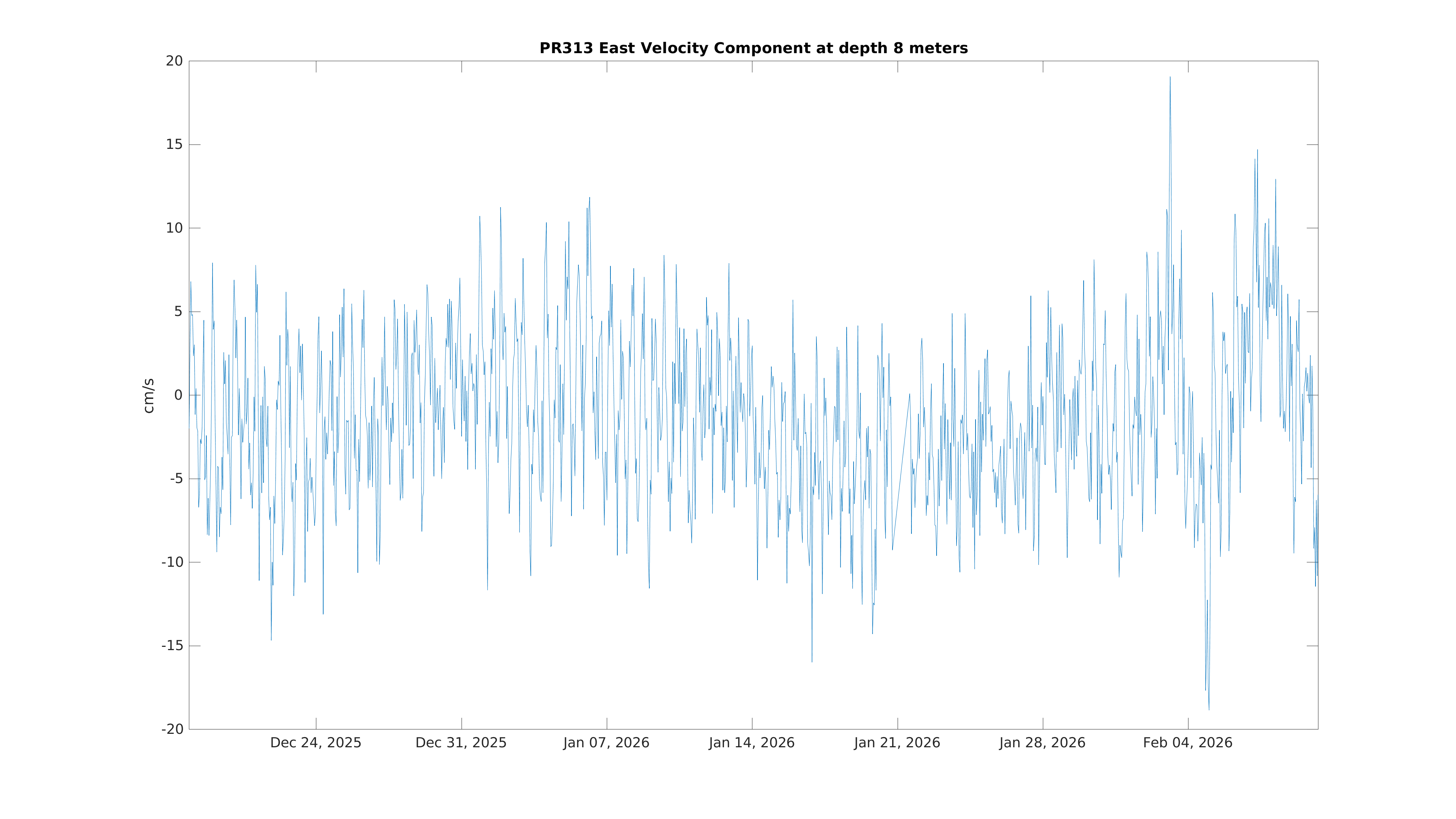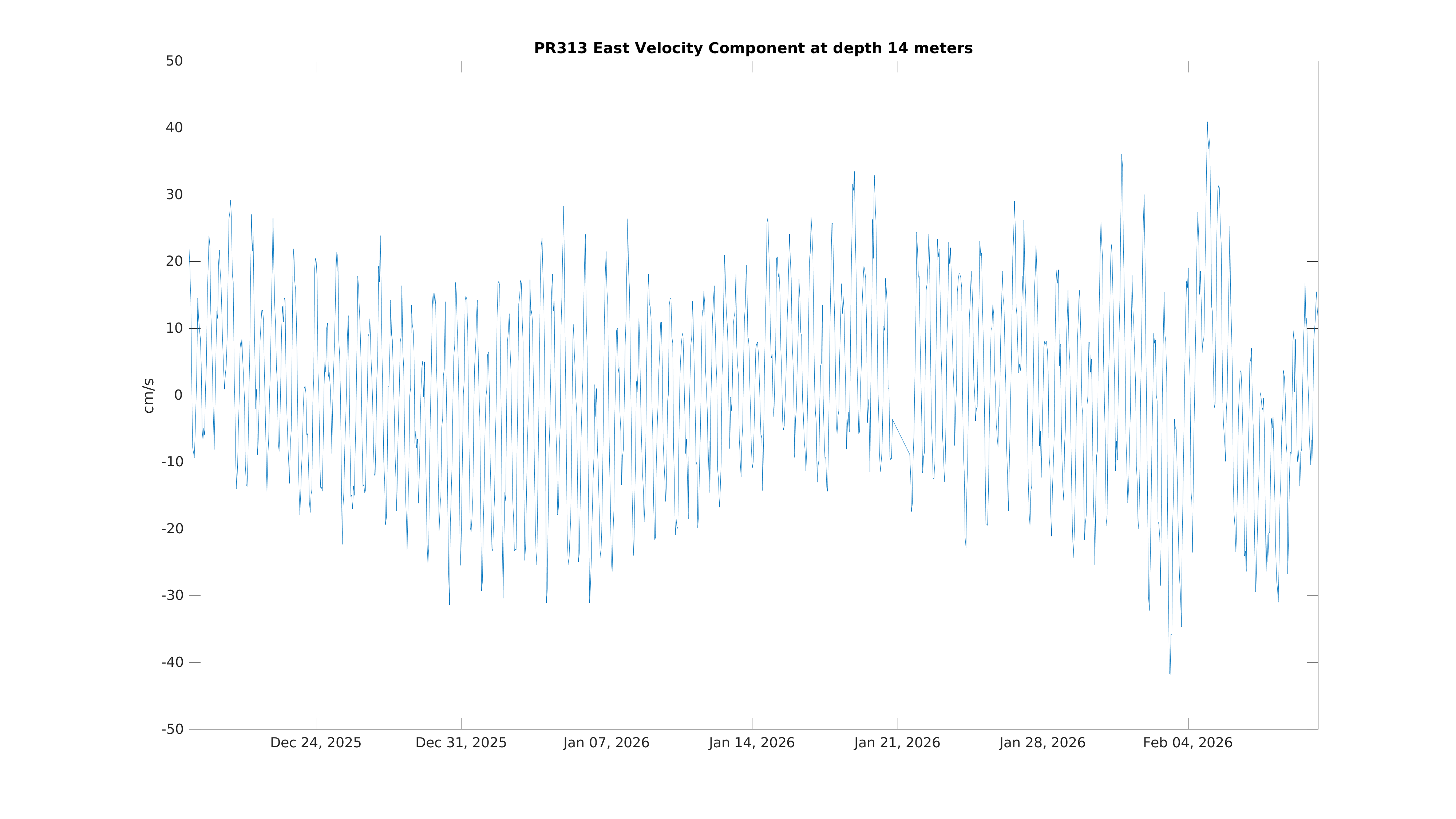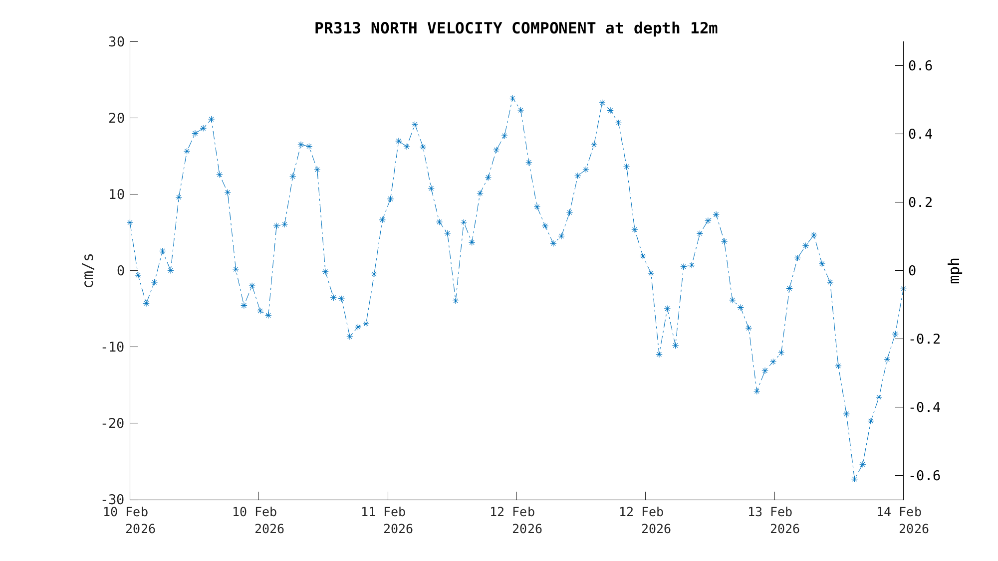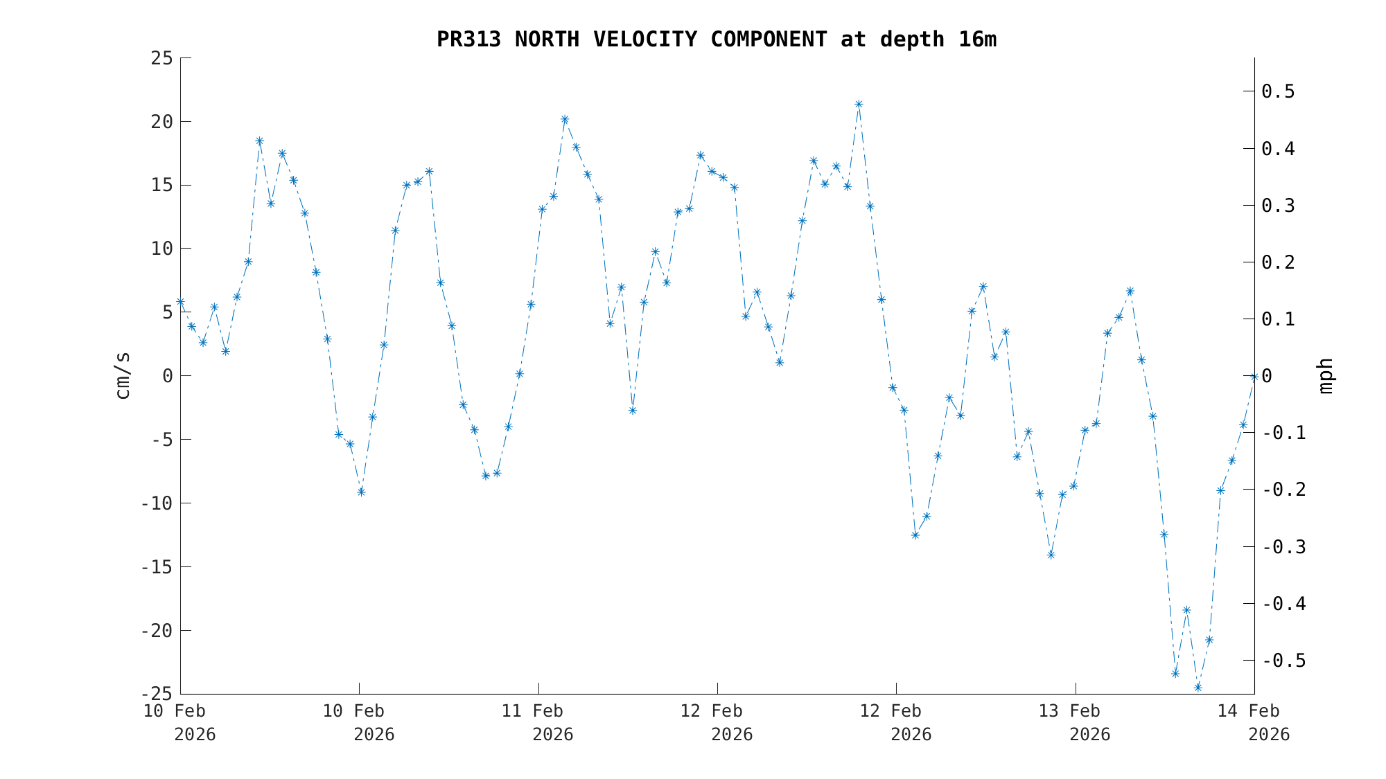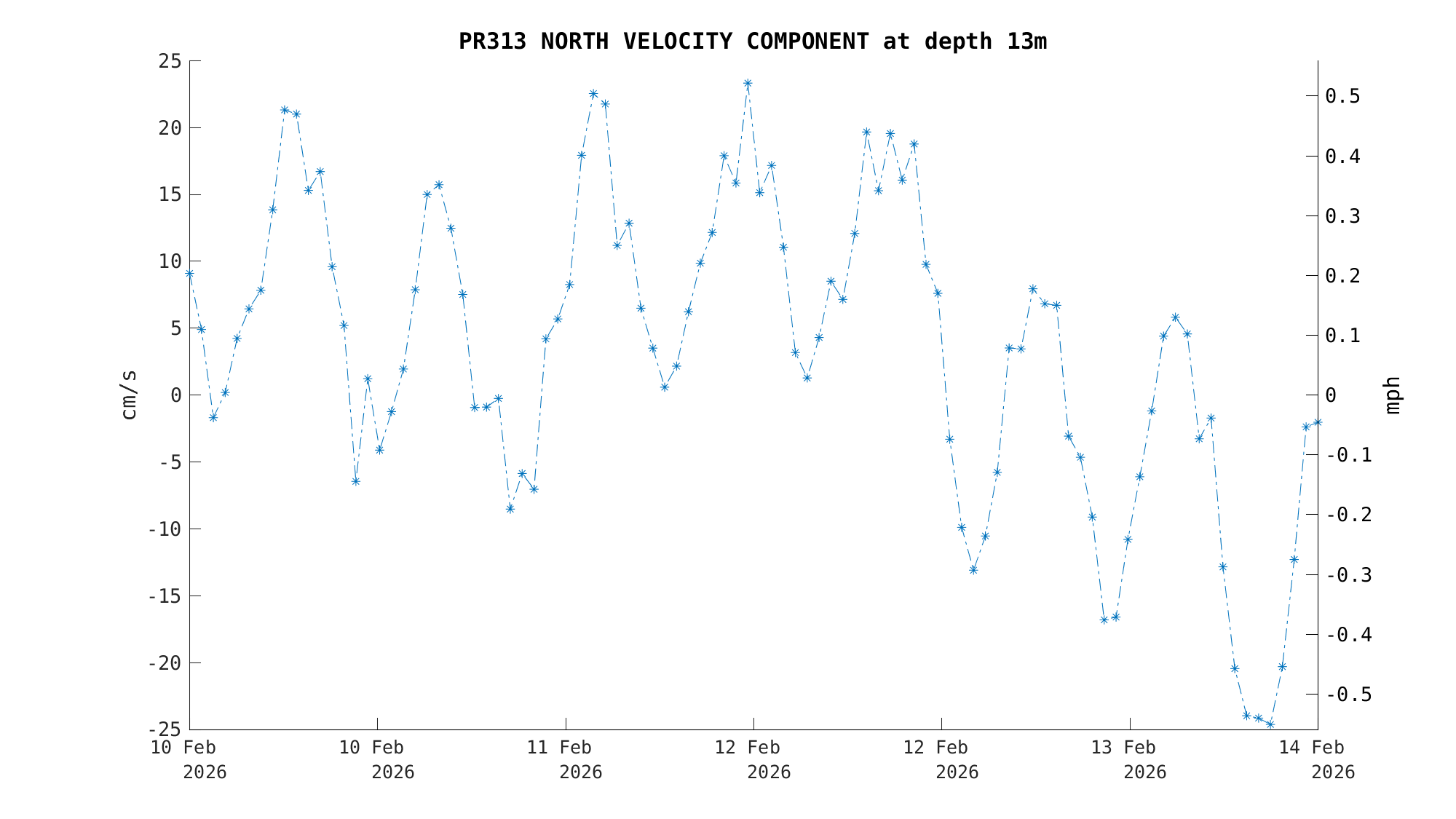 | North Current Velocity (13m) | 4.1 cm/s (0.08 kts) | 2026-02-14 16:00:00 |