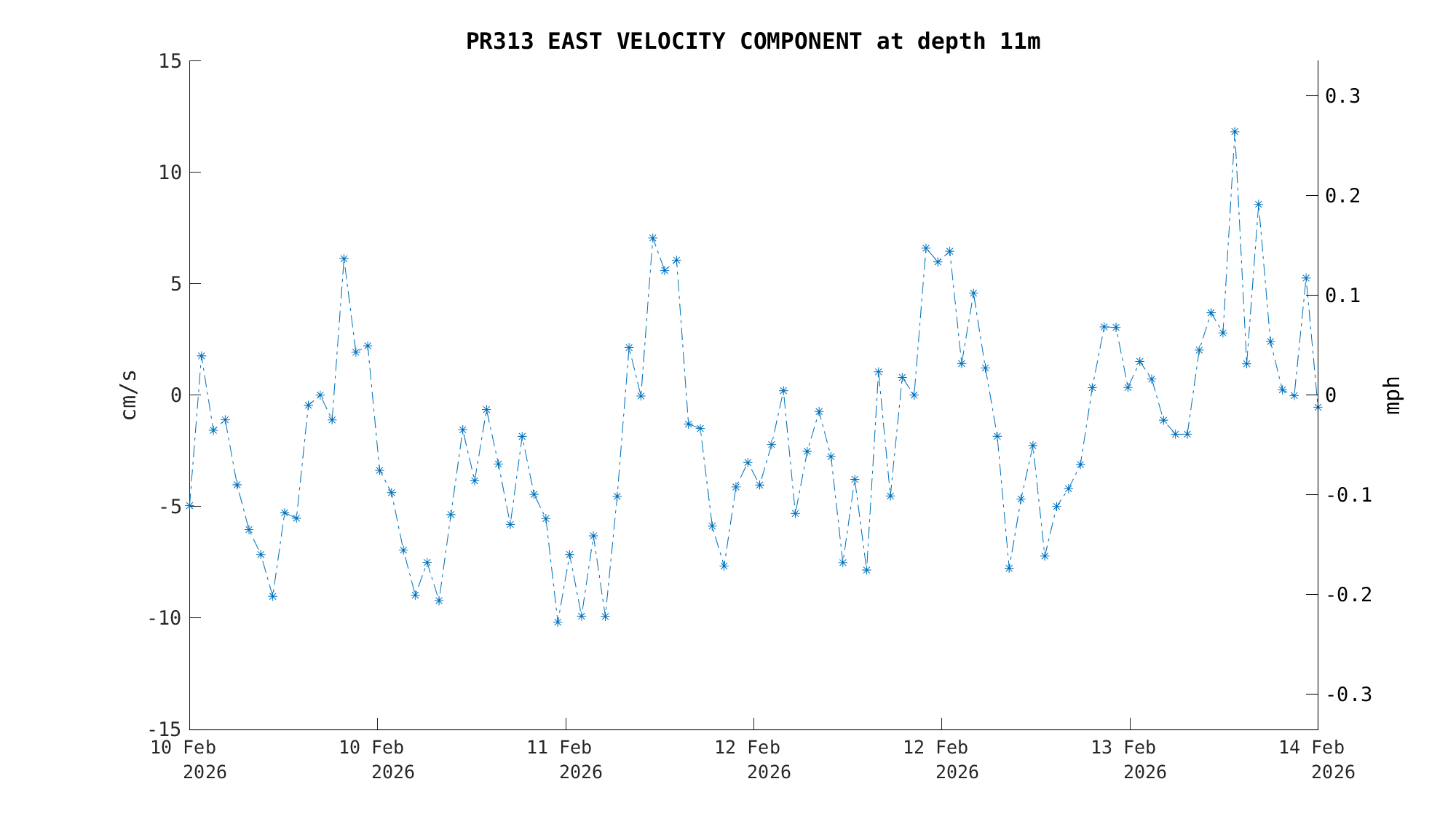 | East Current Velocity (11m) | -4.9 cm/s (-0.10 kts) | 2026-02-14 16:00:00 |