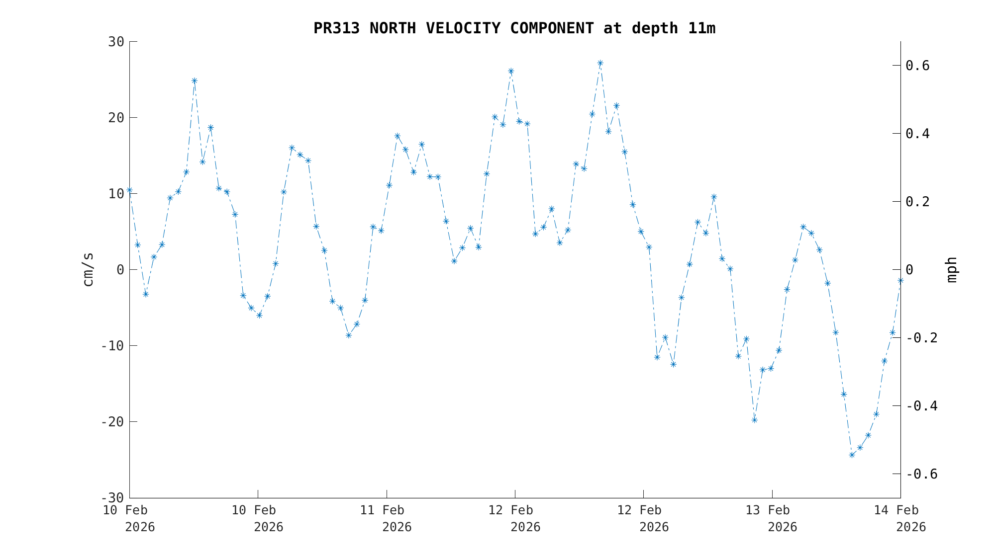 | North Current Velocity (11m) | -3.9 cm/s (-0.08 kts) | 2026-02-14 16:00:00 |