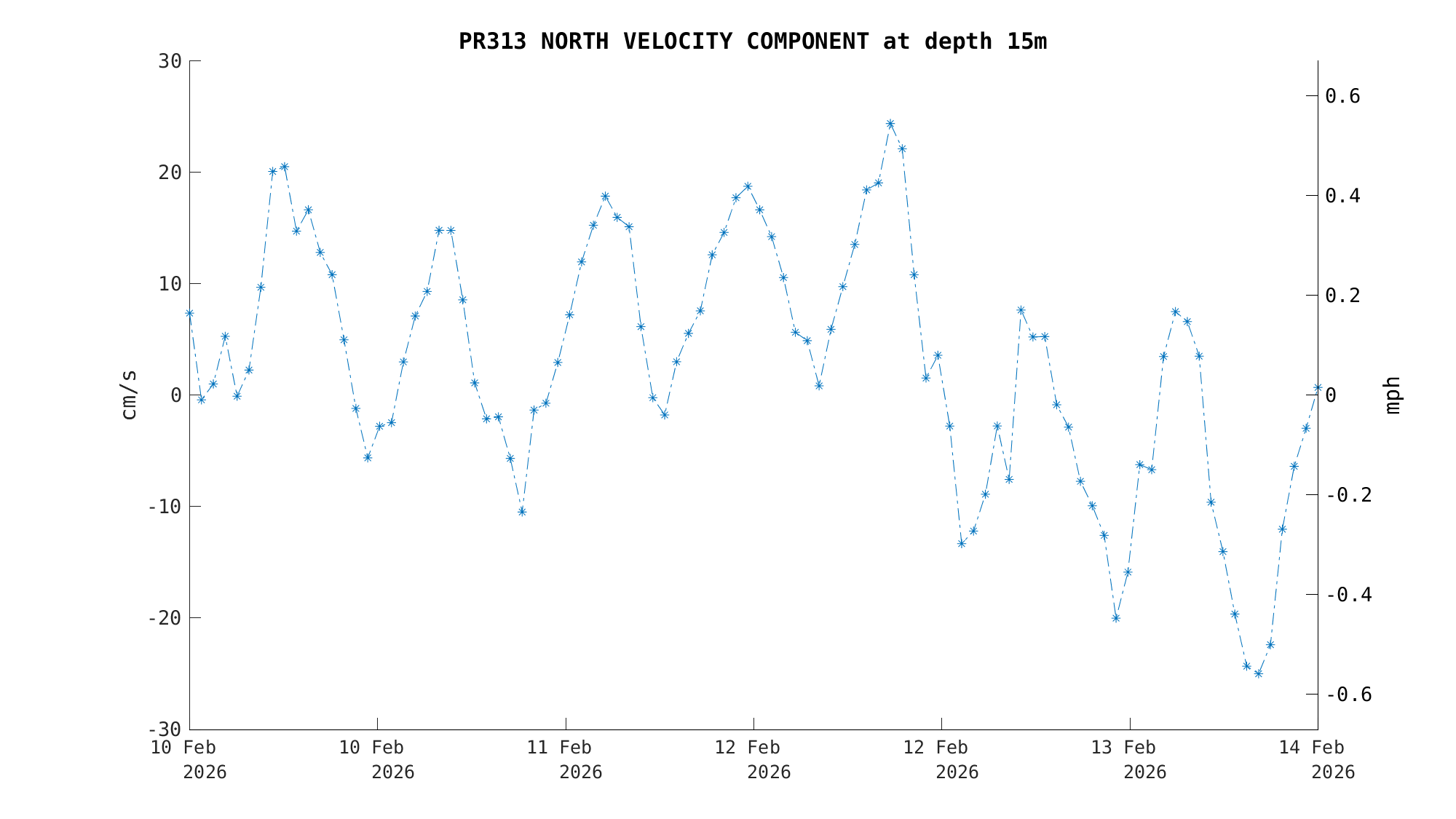 | North Current Velocity (15m) | -2.8 cm/s (-0.05 kts) | 2026-02-14 16:00:00 |