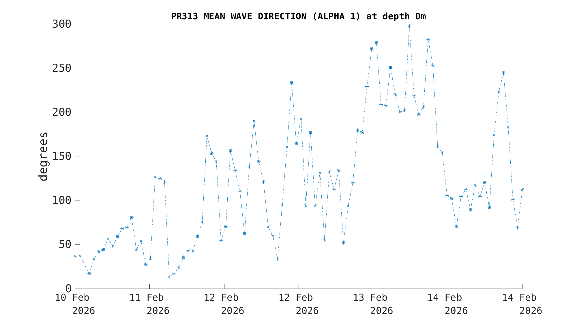 | Mean Wave Direction (0m) | 10.6 degrees | 2026-02-14 16:00:00 |