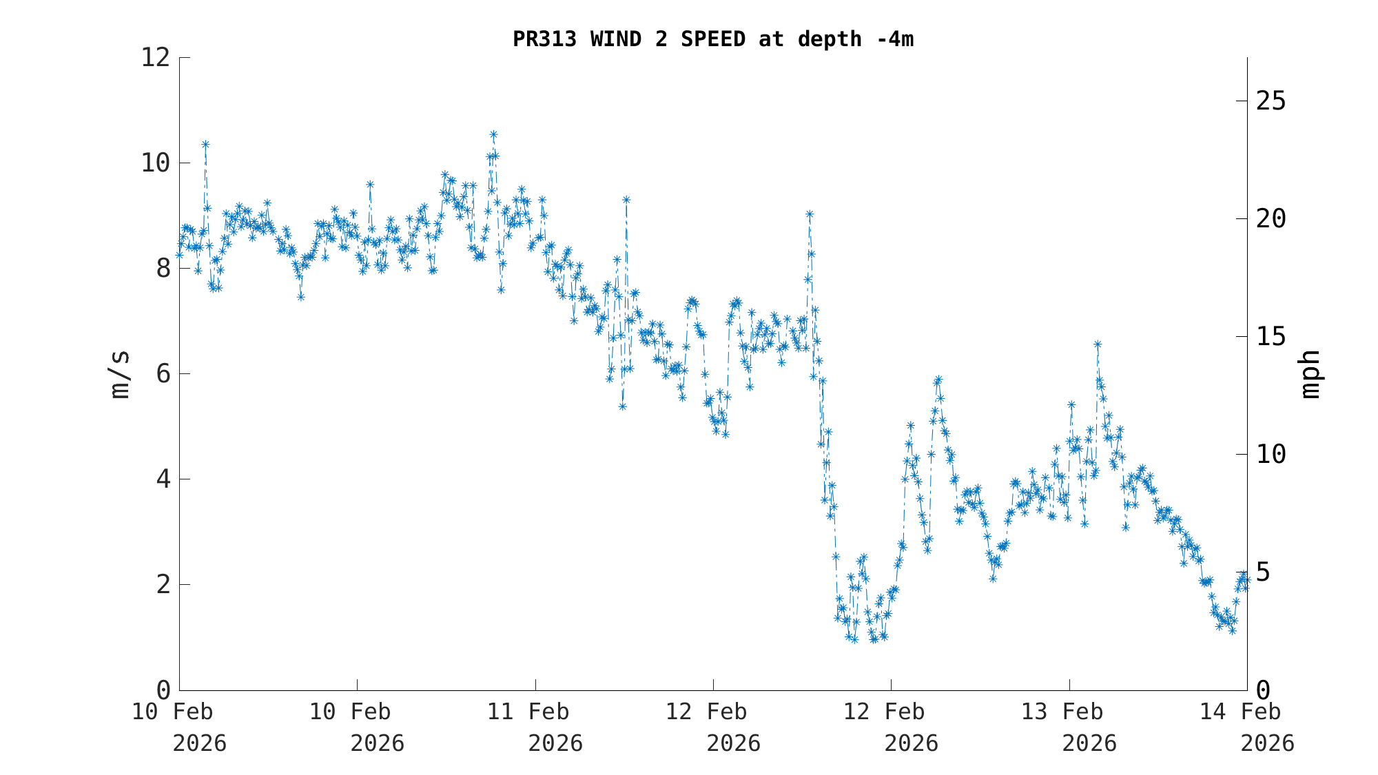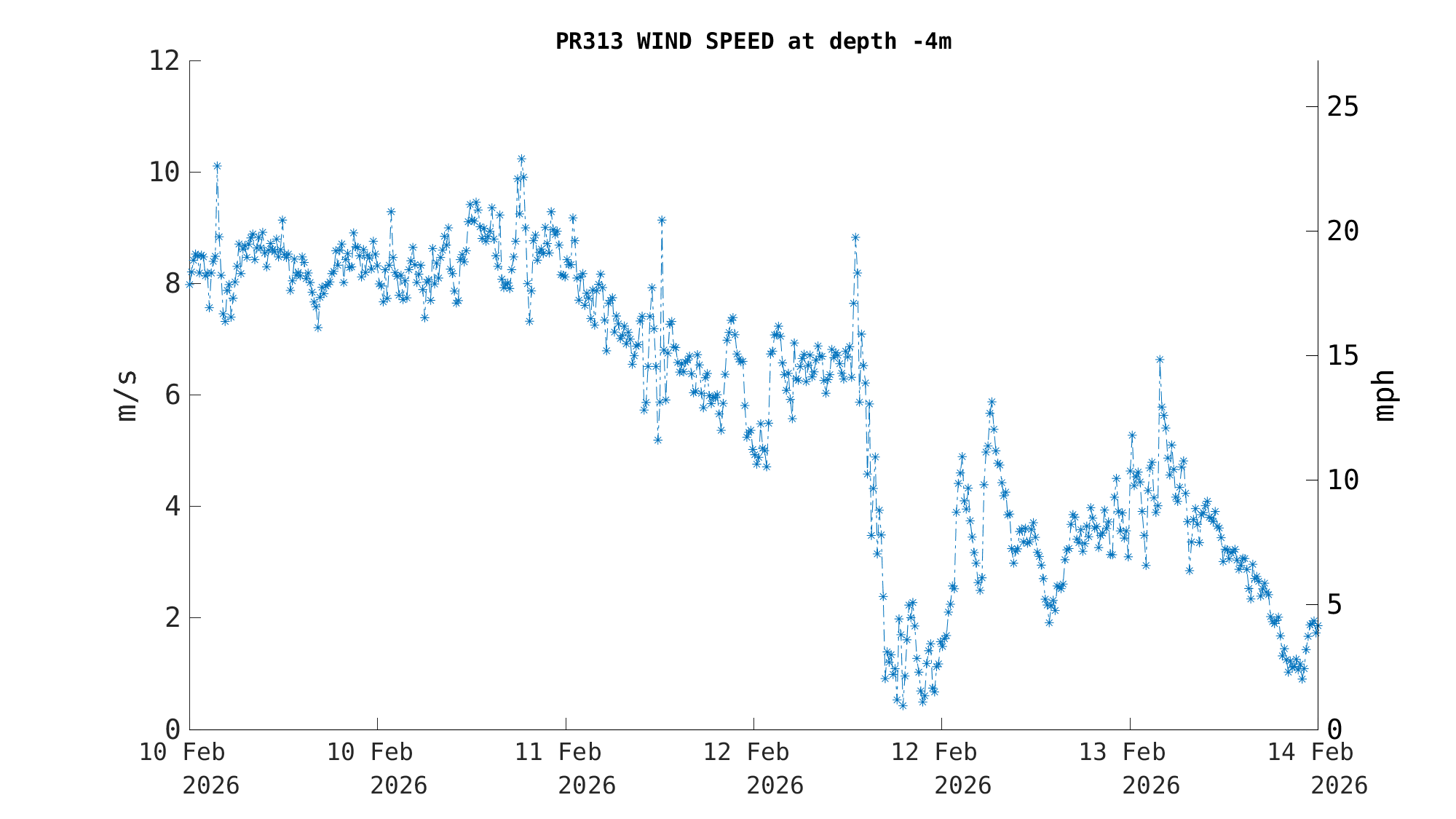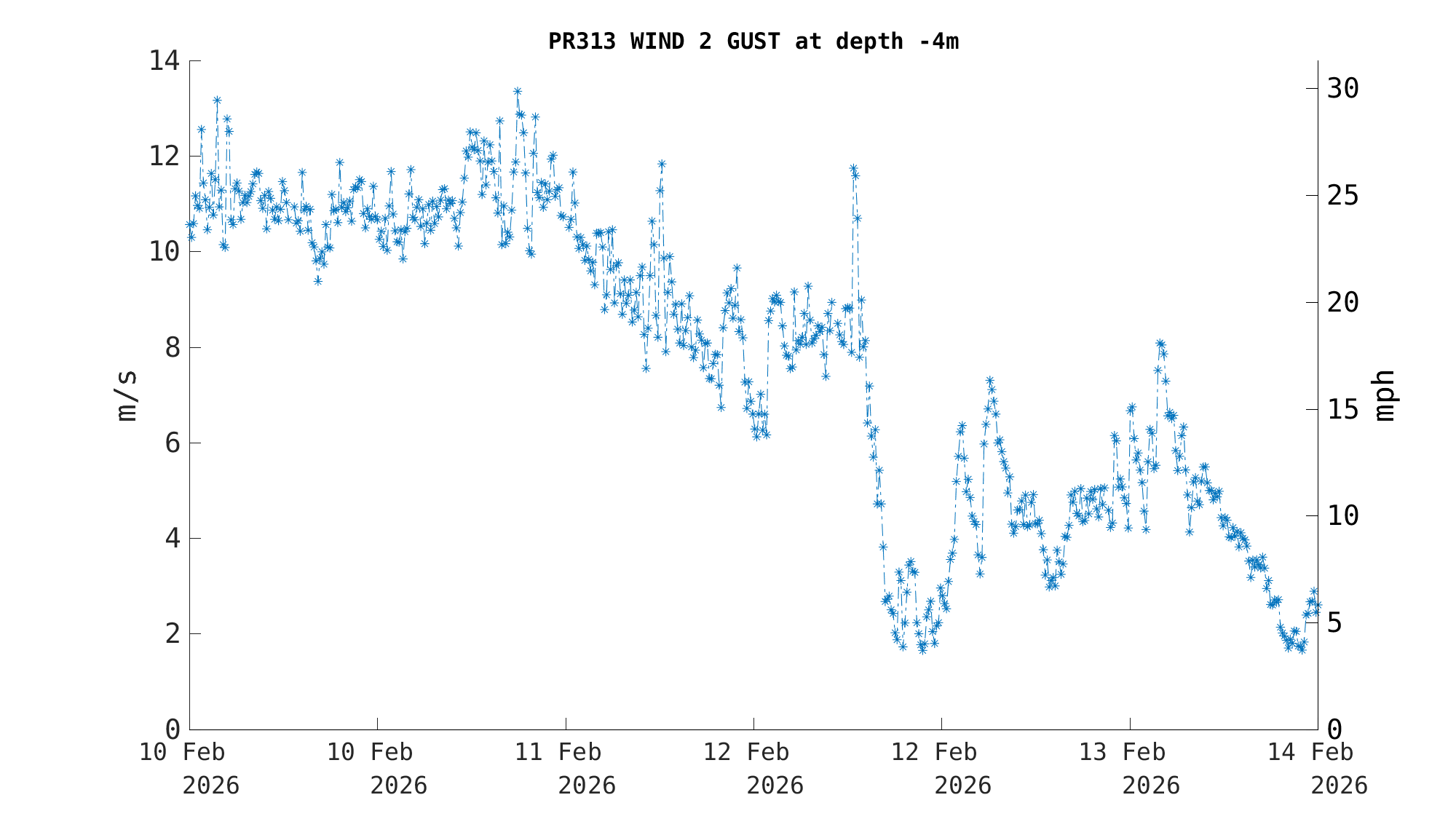 | Wind Speed (-4m) | 3.5 m/s (8 mph, 7 kts) | 2026-02-14 16:30:00 |